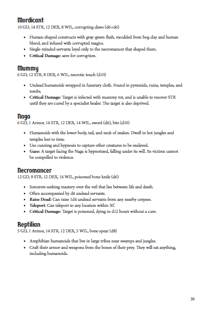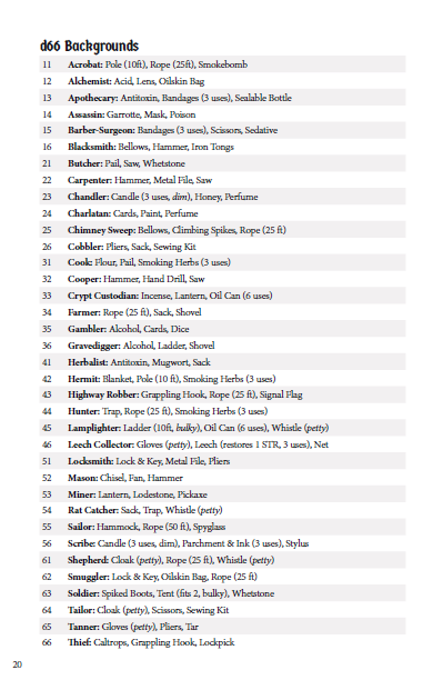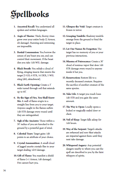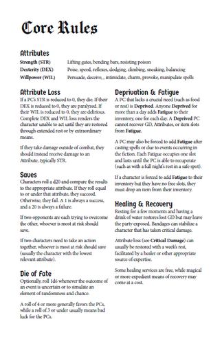 It includes rules for classless, random character generation, dungeon and wilderness exploration procedures, spellbooks, artifacts and a bestiary.